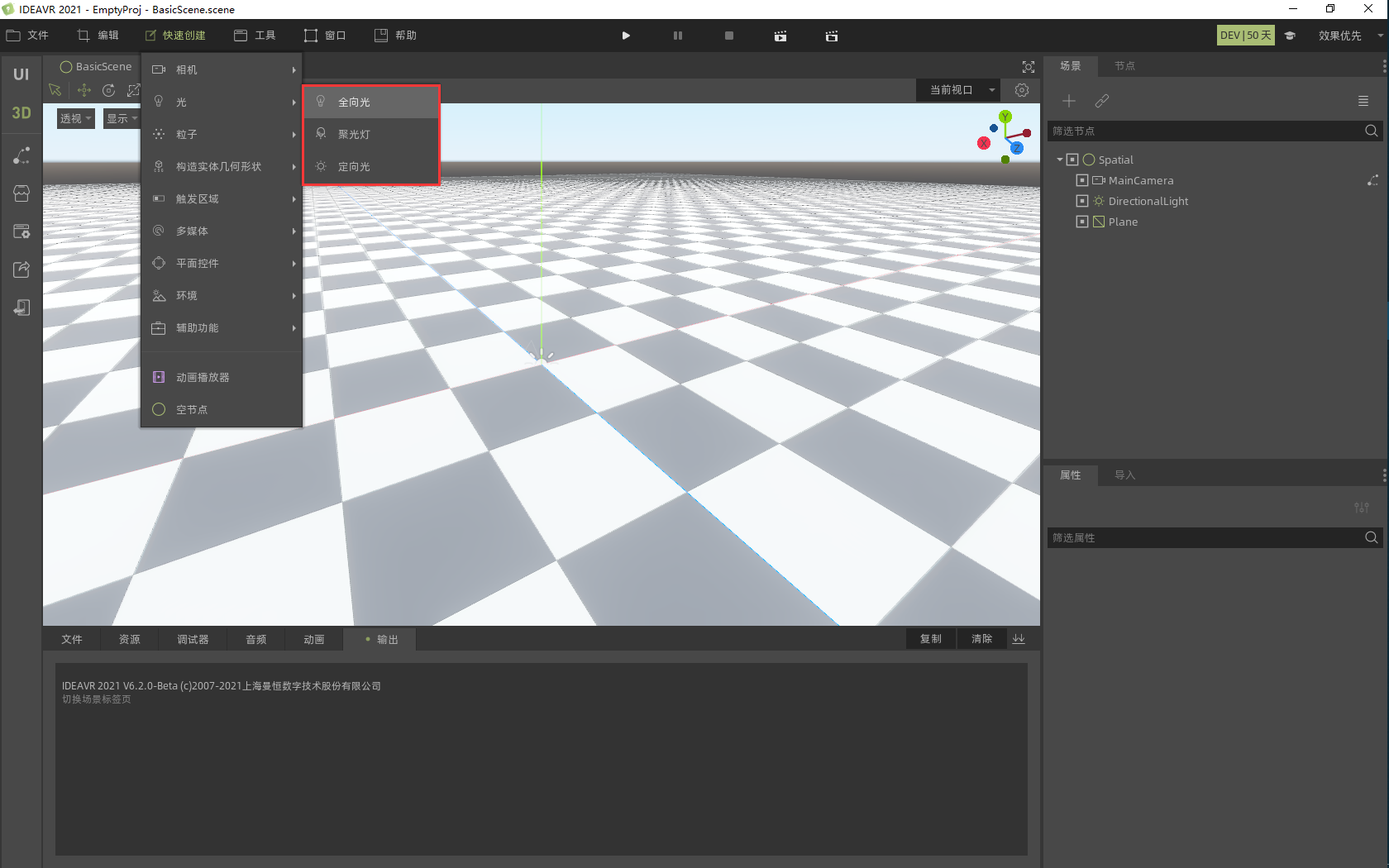 点击**快速创建→光**可以看到三种光源,点击后可在场景中创建对应的光源