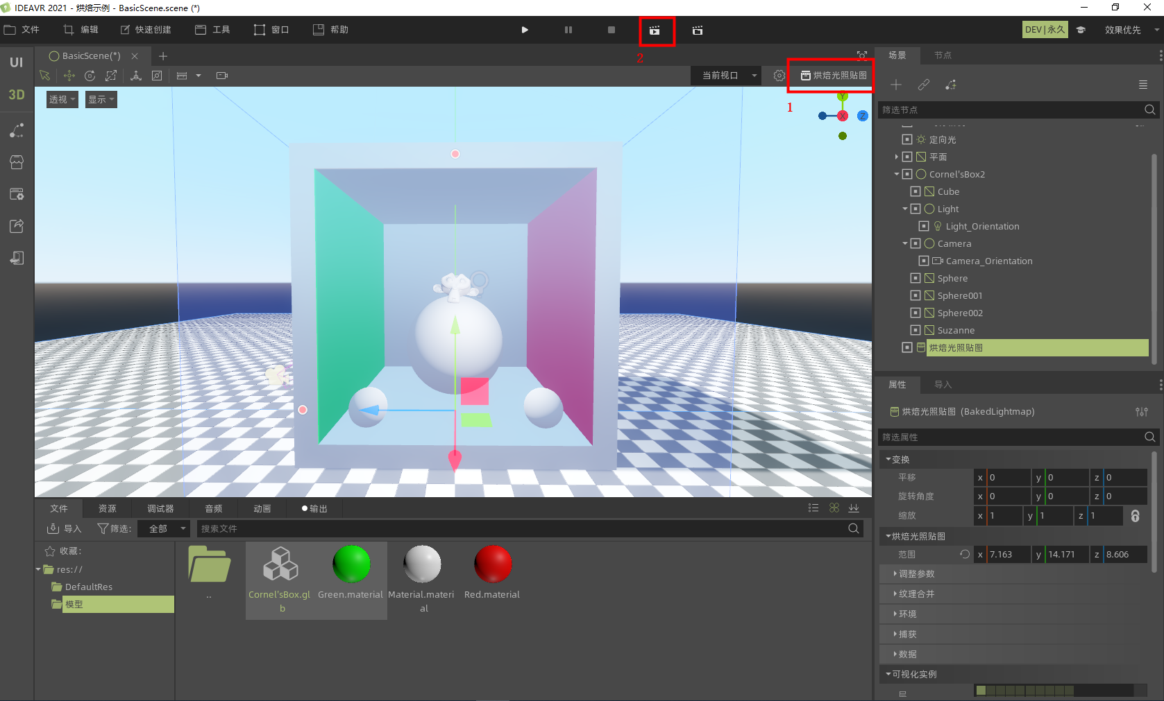 最后,选中烘焙光贴图节点,点击 烘焙光照贴图 (图中1处),弹出的窗口中点击 保存 ,加载完成后,点击 运行键 (图中2处)运行当前场景