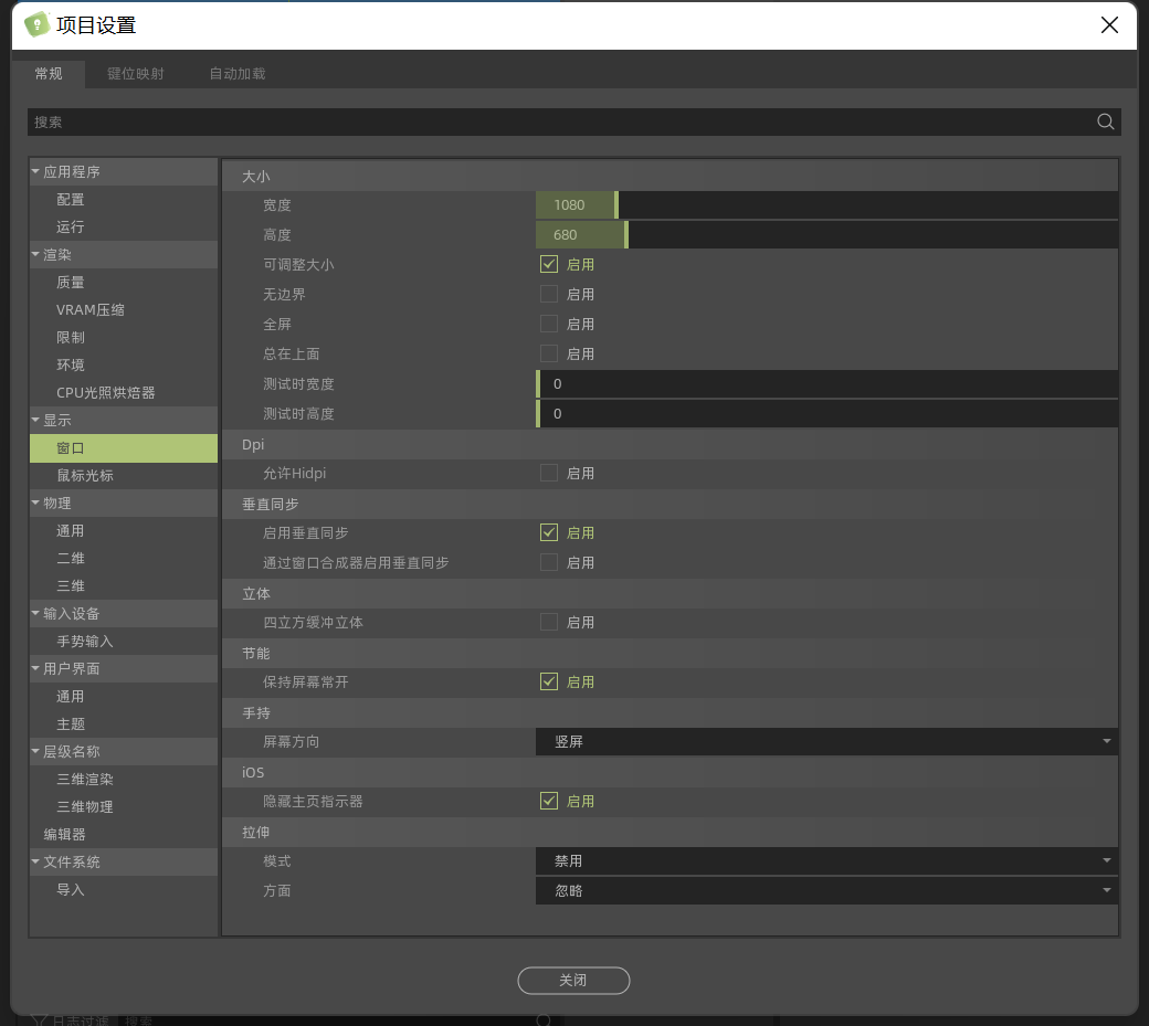 - 测试时高度 如果大于0,则在运行游戏时覆盖窗口高度。 用于测试拉伸模式。