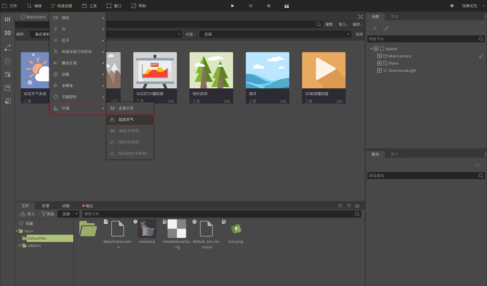 IdeaVR为用户提供了丰富的资源以方便用户进行场景创建,通过资源商店用户可以下载一些已经创建好的插件和美术资源,并通过快速创建进行使用。通过素材库,拖拽对应的素材,可快速创建一些系统预设的素材资源。