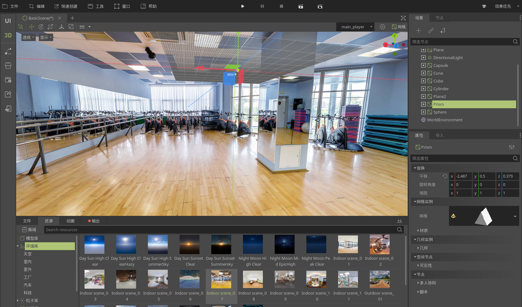 模型库提供可拖拽到场景的一些基本模型,其本质为不同的网格实例。用户可拖拽不同的模型到场景创建不同形式的网格实例