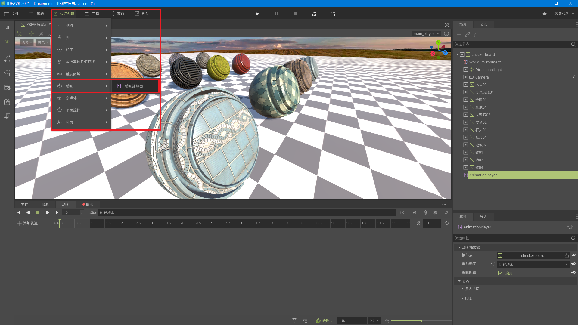 动画播放器创建完成后,我们需要进行动画轨道的创建,选中 动画播放器节点 ,在IdeaVR编辑器下方的 动画 按钮,选择新建动画,对应场景如下: